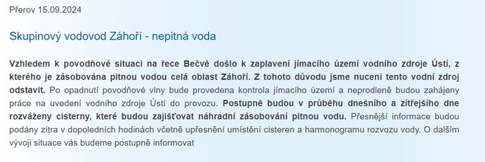 Vzhledem k povodňové situaci na řece Bečvě došlo k zaplavení jímacího území vodního zdroje Ústí, z kterého je zásobována pitnou vodou celá oblast Záhoří. Z tohoto důvodu jsme nuceni tento vodní zdroj odstavit. Postupně budou v průběhu dnešního a zítřejšího dne rozváženy cisterny, které budou zajišťovat náhradní zásobování pitnou vodu. Přesnější informace budou podány zítra v dopoledních hodinách včetně upřesnění umístění cisteren a harmonogramu rozvozu vody.