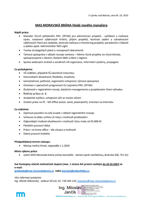 MAS MORAVSKÁ BRÁNA hledá nového zaměstnance na pozici manažera, bližší info v příloze níže.